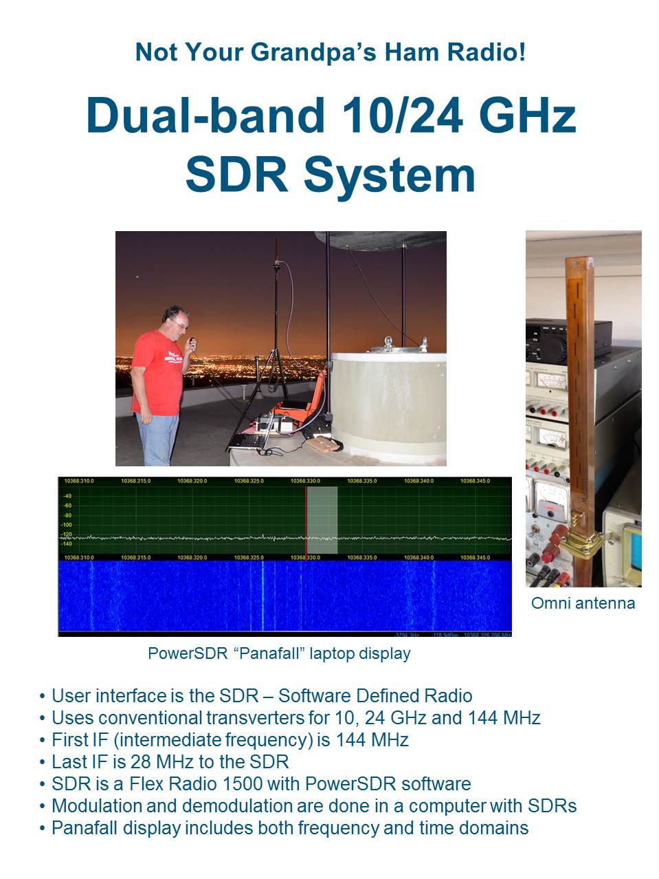 Dennis W6DQ displayed his Flex 1500 software defined radio with 10 GHz and 24 GHz transverters. There were many questions about SDRs and many visitors were surprised to learn ham radio operators have this technology. But this is another example of what radio hams are using these days. The system Dennis showed is actually three systems in one: The SDR, which is being used as the “intermediate system,” and transverters (transmitter-receiver-converters) for 10 GHz and 24 GHz microwave ham radio. The posters briefly explain the transverter system: