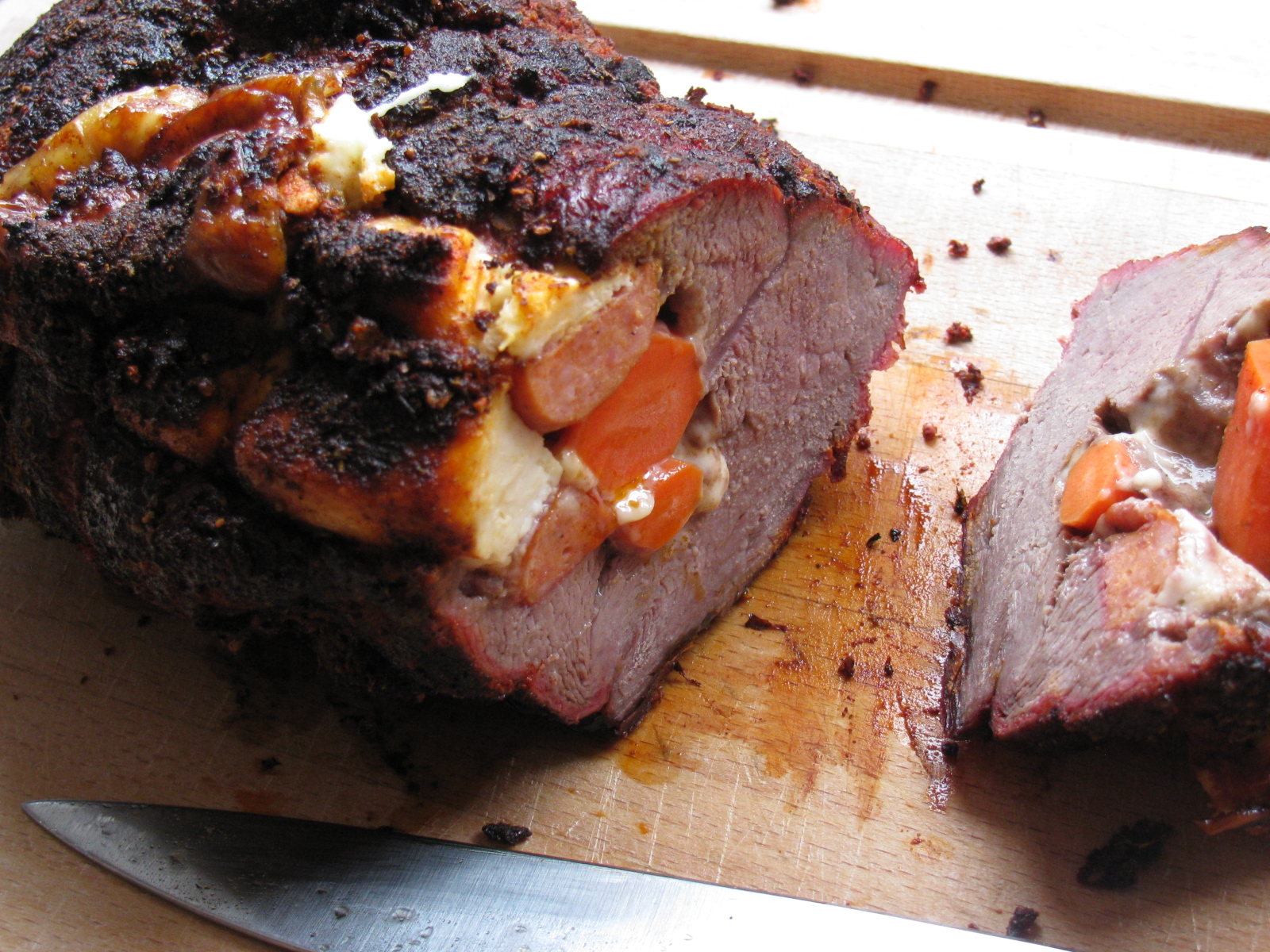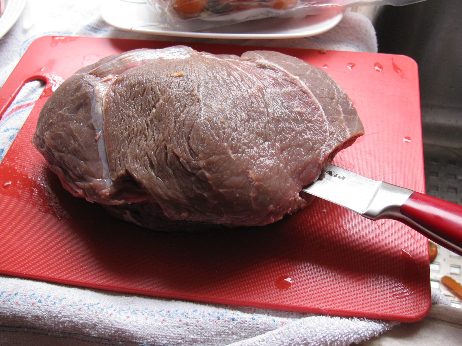 In Raichlen’s version, you poke a knife through the roast, then stuff the stuffing items in. After almost poking my hand with the knife, I decided to butterfly cut the roast, add the stuffing, and roll it, just like a matambre. Much easier.