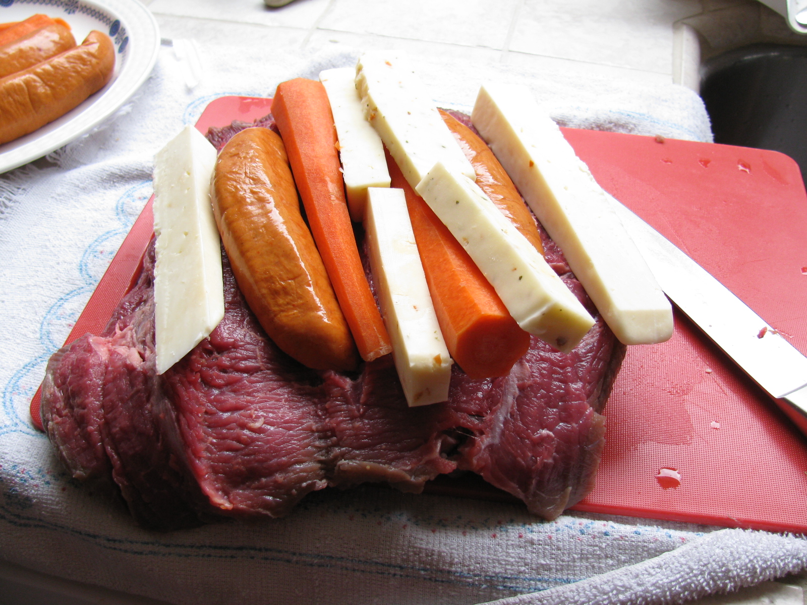 I substituted the romano cheese with some habanero jack cheese, since it was on sale, and I thought some hotness would taste good with the beef. For the sausage, I used some Louisana hot links, the same sausages I use when I make matambre.