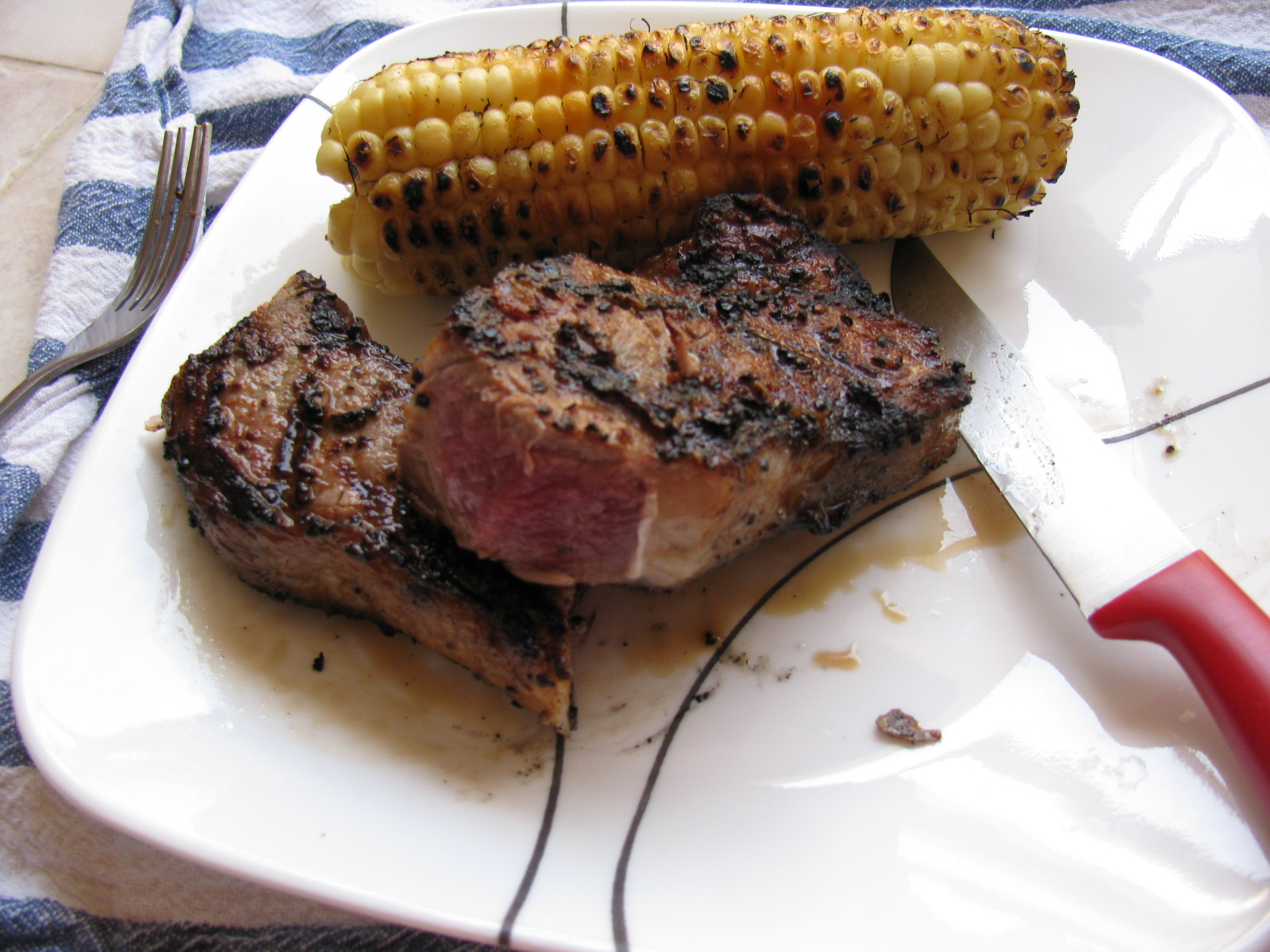 I thought this crust – made of salt, pepper, powdered mustard and Tabasco sauce – would be very spicy, but I found out that this is not the case, and will add more Tabasco if I make this again. Here are some pictures of the steaks and some corn on the cob.