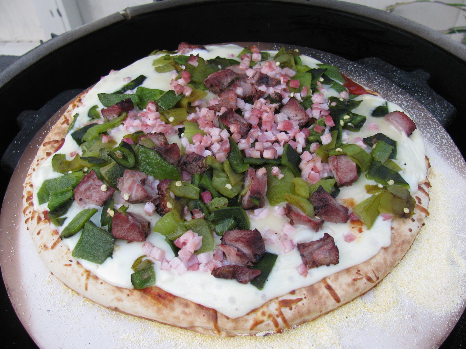 Here we go – Steak, Ham and Pepper Pizza on the Big Green Egg.