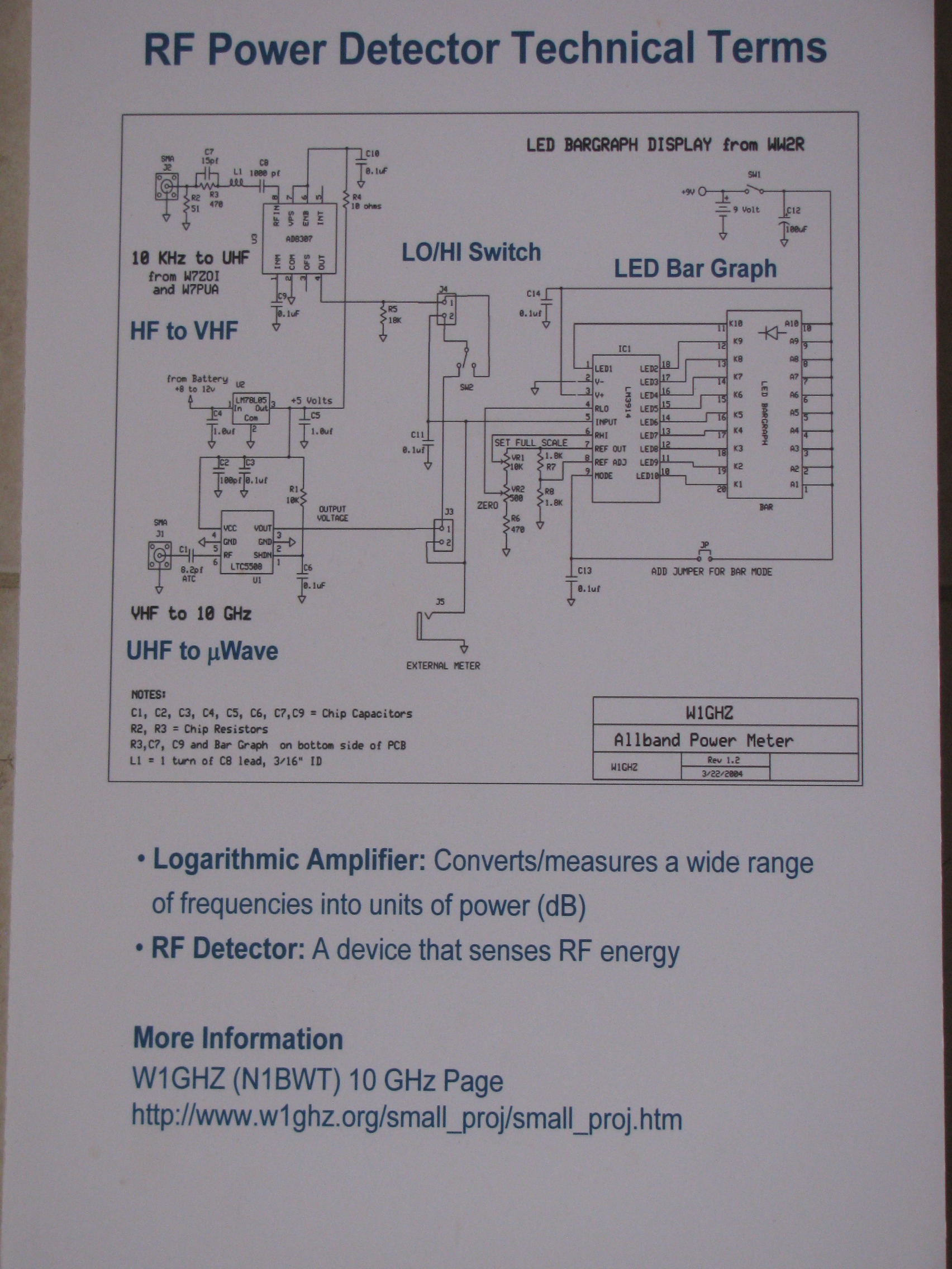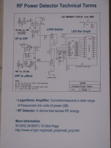 The RF detector is based on a portable power meter available as a kit from Down East Microwave (DEMI). It is called the W1GHz All Band Power Meter Complete Kit, Model ABPM. I replaced the LED bar graph display with individual LEDs to make the “meter” more visible.