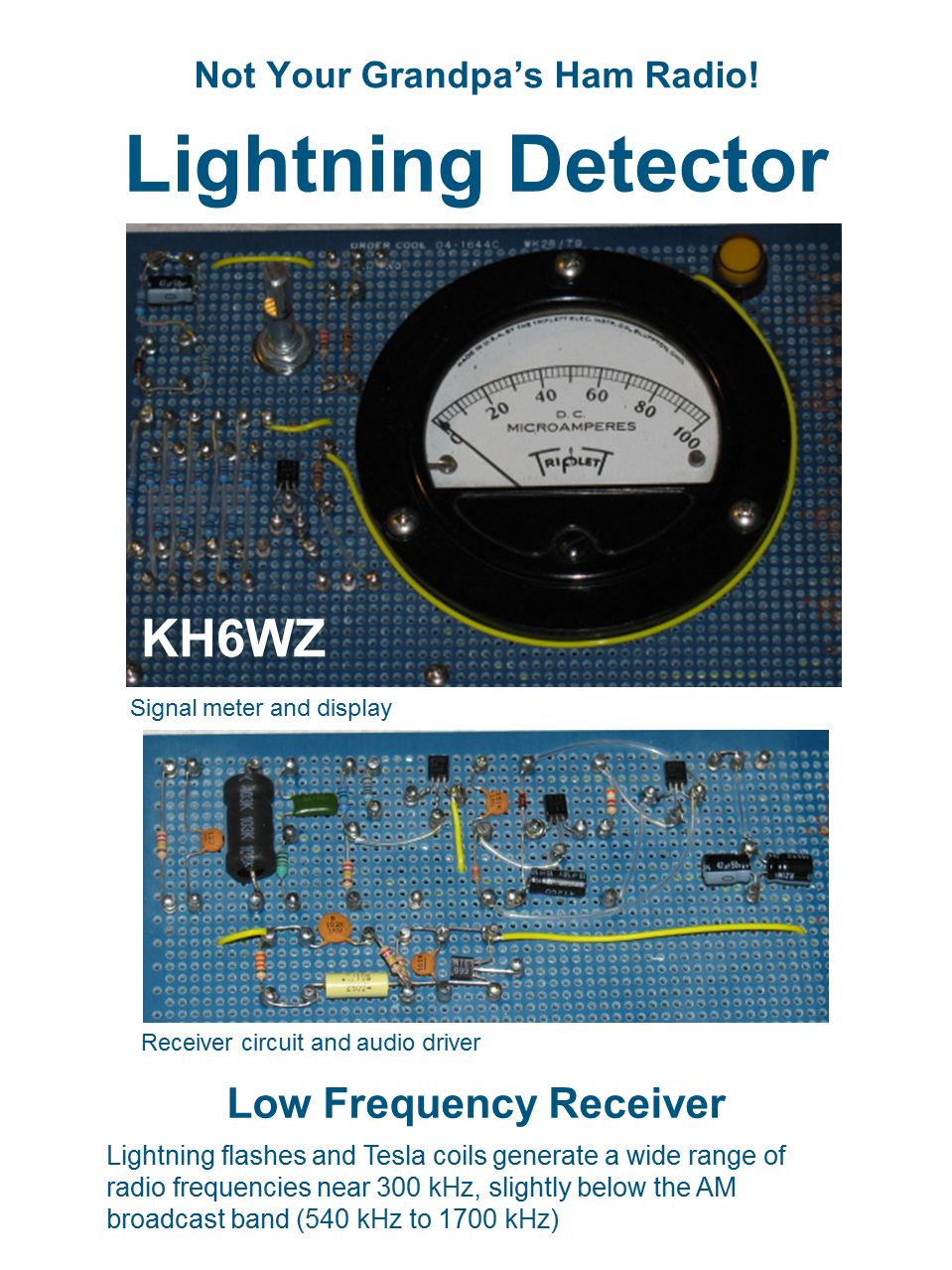 As mentioned during the show, the lightning detector is a very low frequency (VLF) receiver. The circuit can be found on Charles Wenzel’s site, TechLib, short for “Technical Library.”