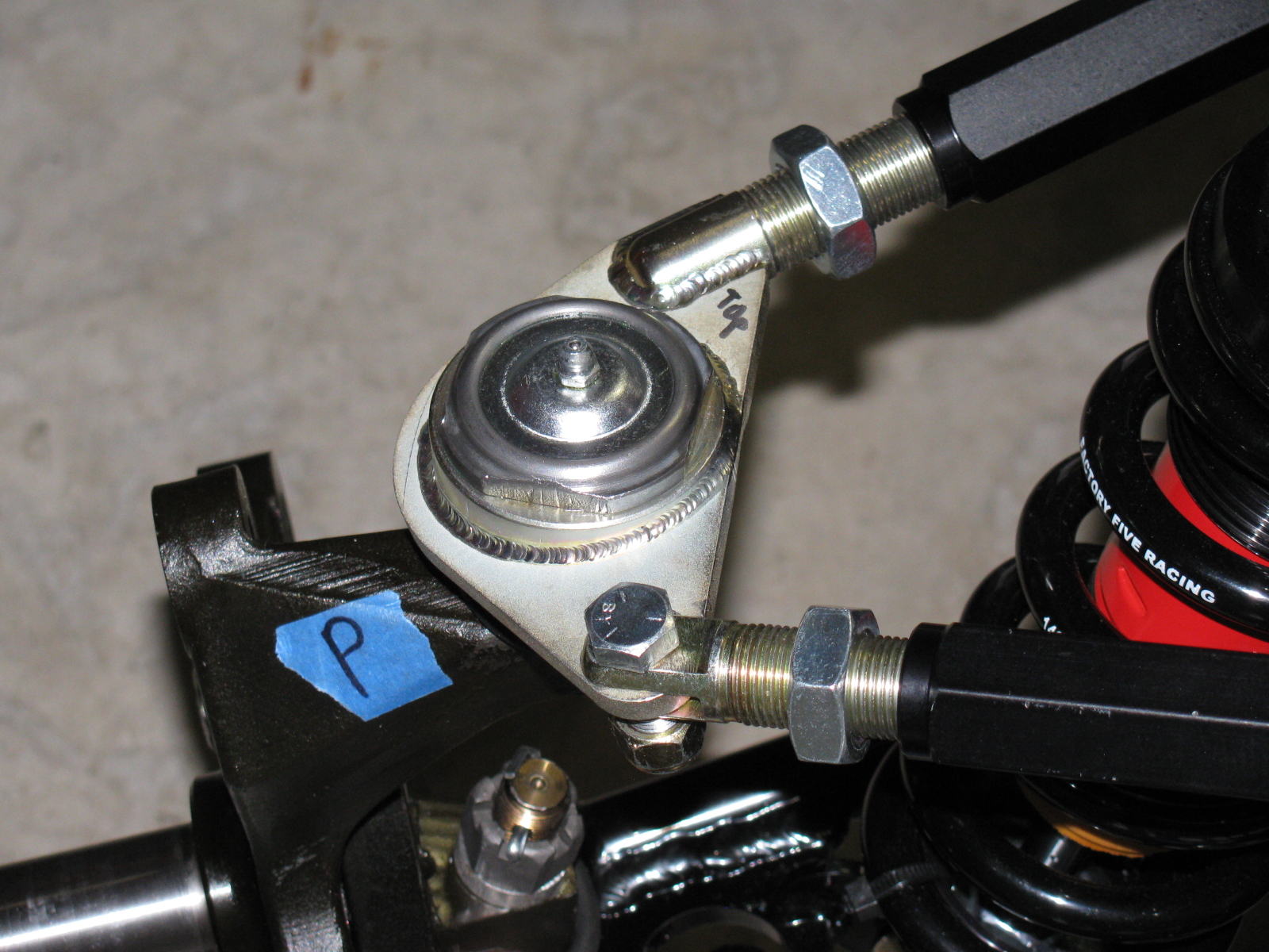 Above left: The IRS upper control arm has another pair of small mounting tabs that are not mentioned in the assembly manual. No pictures are included in the manual, either. After a quick search on the Factory Five forum, I found out the smaller set of tabs point downward, and are used for quad shocks – used to minimize wheel hop during acceleration.