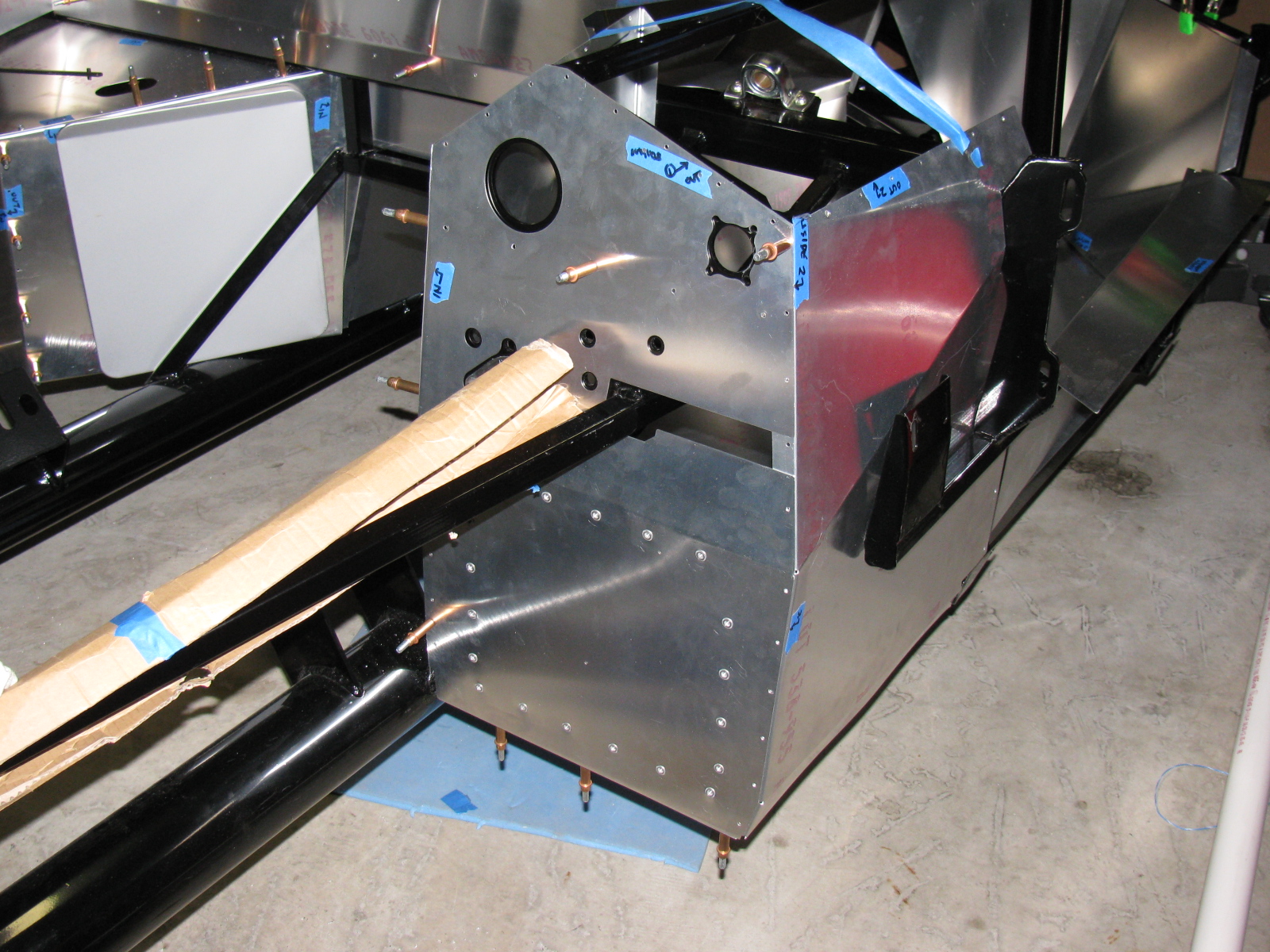 Here’s the driver footbox with riv-nuts installed. All aluminum panels for the engine bay will be powder coated, the others will be painted.