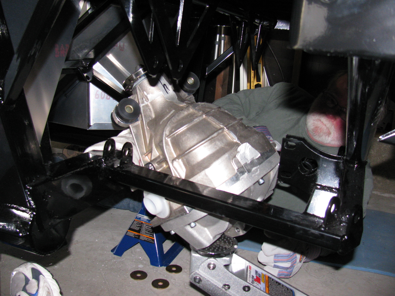 Since my ham radio friend Larry was going to stop by for a visit, I decided it would be a great time to get him to help me boost the rear differential (pumpkin) into the rear suspension cage. The Factory Five Racing assembly manual calls this unit the “IRS center section.”