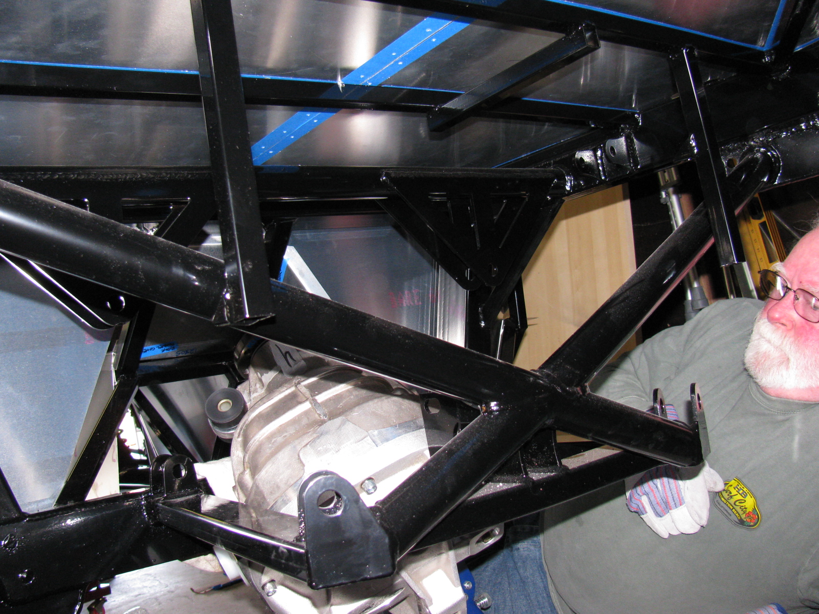 I began to think about getting a grinder and removing any offending protrusions on the differential case and chassis to make this thing fit. My ham friend Larry had to leave, but a neighbor showed up, who also happened to be a car builder. I put Phil to work right away…