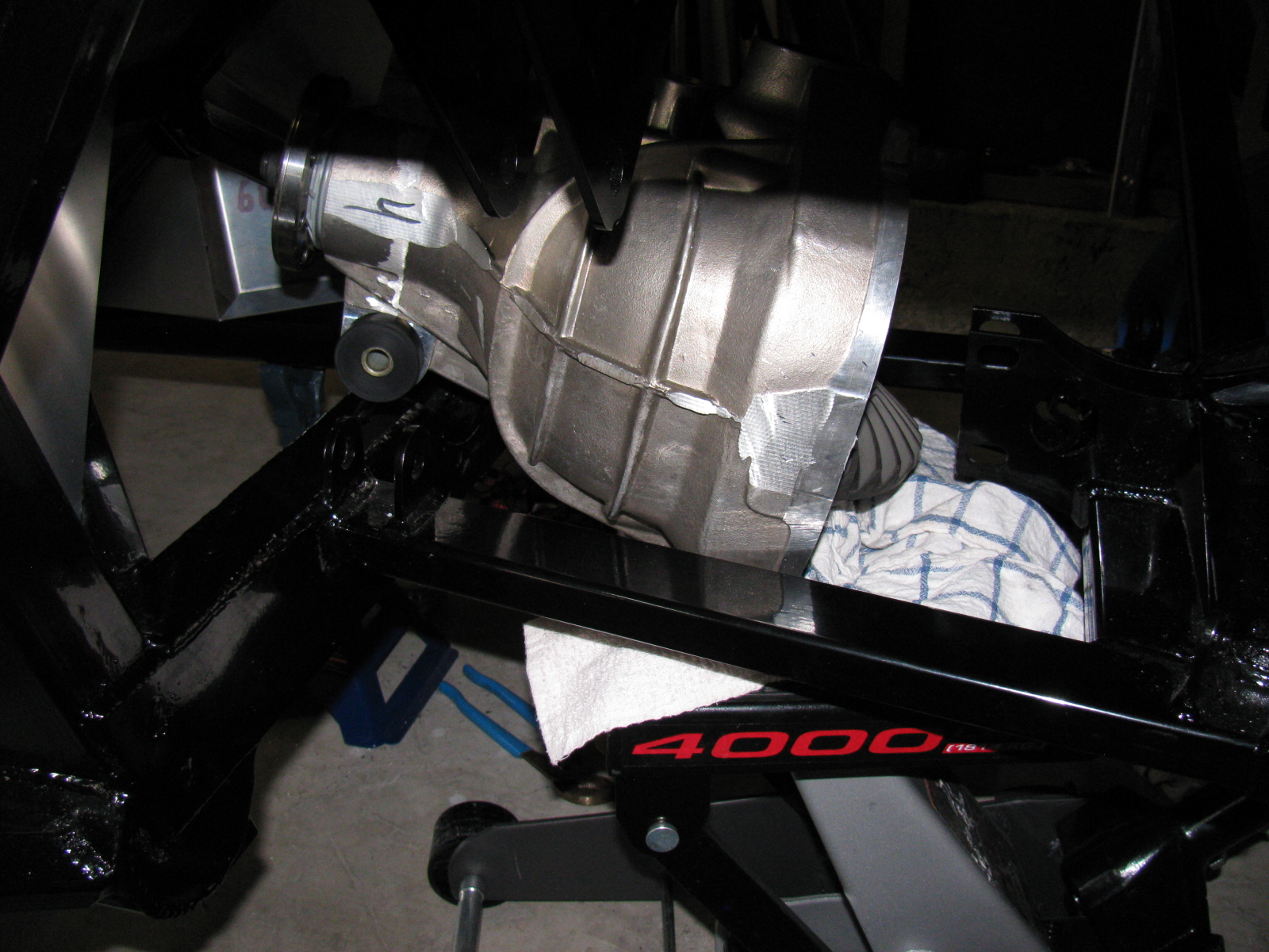 Of course, now the differential must be re-sealed, so we tried a dry run with the rear cover. Yes, this will work. I currently have the pumpkin suspended above the mounting location, held in place with the jack, a 2×4, and a nylon strap. I will finish mounting this beast at the next build session.