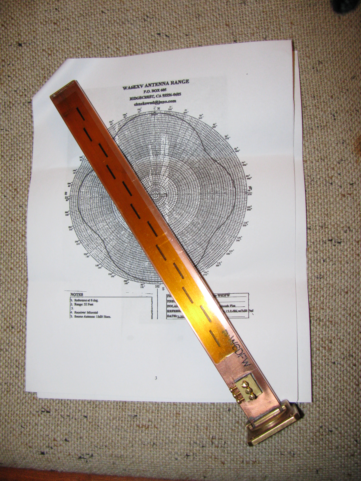 Here’s a picture of this omni-directional microwave antenna. The background is the radiation pattern plotted by another SBMS member, Chuck, WA6EXV.