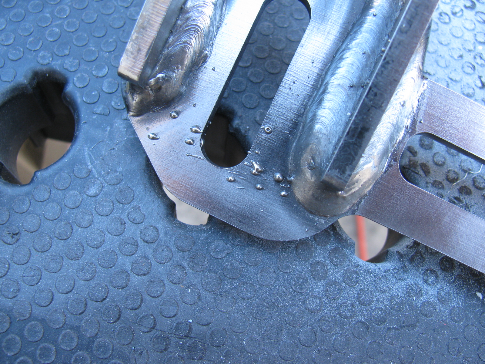 I did the same with the door hinges. Here you can see some weld splatter that will interfere with the mounting bolts, so I used a Dremel tool to grind those weld balls off.