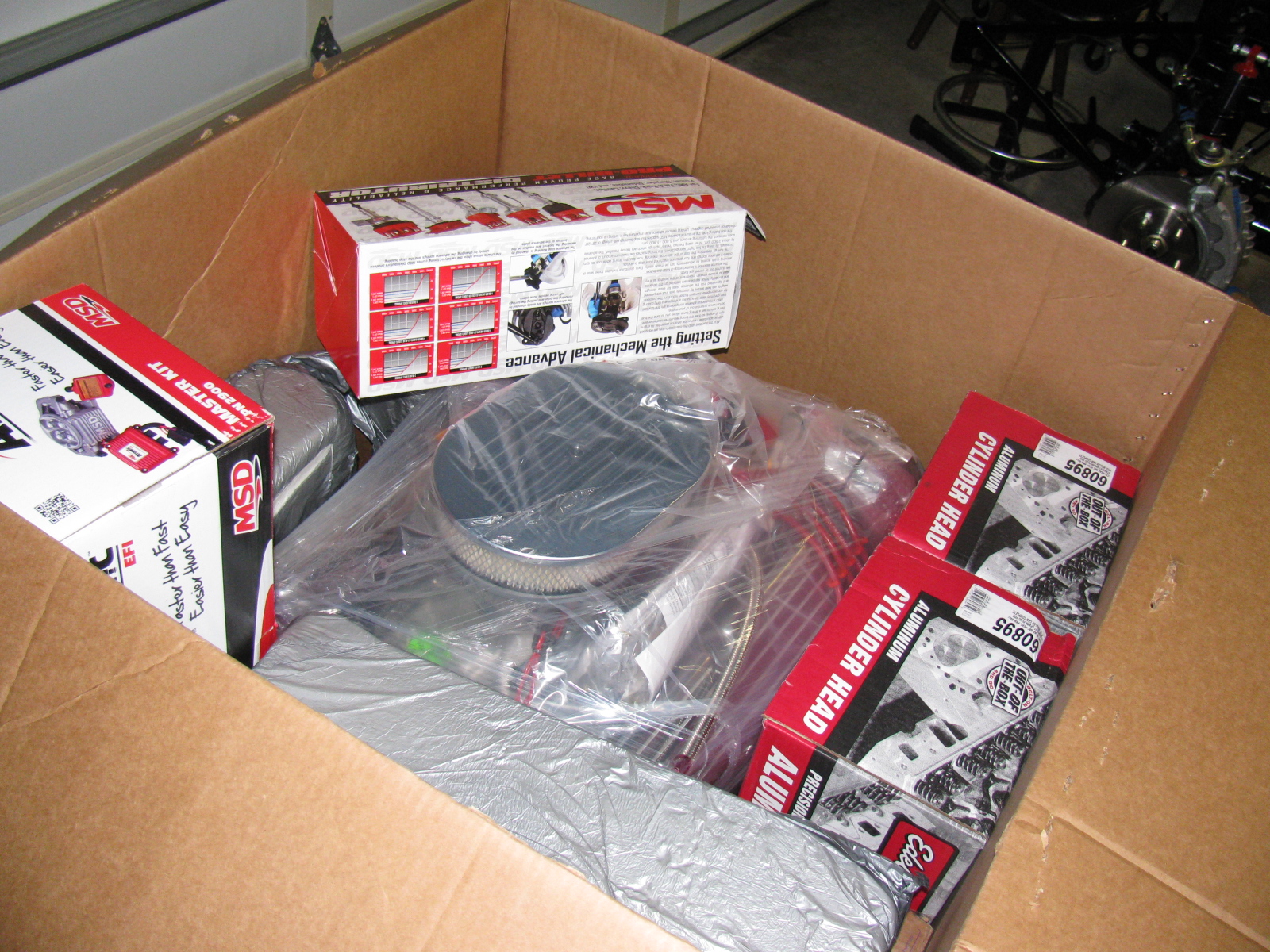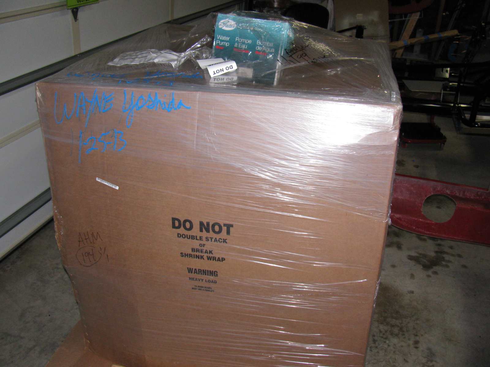 Big day today – the 302 V8 and T5Z transmission from The Engine Factory arrived. I like how everything has little tags to tell me what this thing does and where it goes.